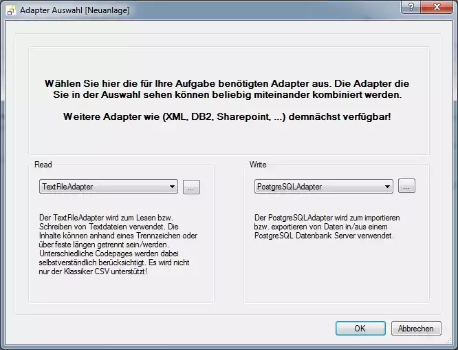 Öffnen Sie den FlowHeater und klicken den Menübefehl "Neu" an um eine neue Definition zu erzeugen. Stellen Sie im folgenden Dialog für den READ Adapter "TextFile Adapter" und für den WRITE Adapter "PostgreSQL Adapter" ein.