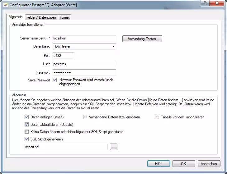 Tragen Sie für den Servernamen den Rechnernamen ein auf dem bei Ihnen der PostgreSQL Server ausgeführt wird, z.B. localhost. Öffnen Sie jetzt das Kombinationsfeld für die Datenbank und wählen hier unsere oben erzeugte Datenbank "FlowHeater" aus. Wechseln Sie jetzt auf den Reiter "Felder / Datentypen".