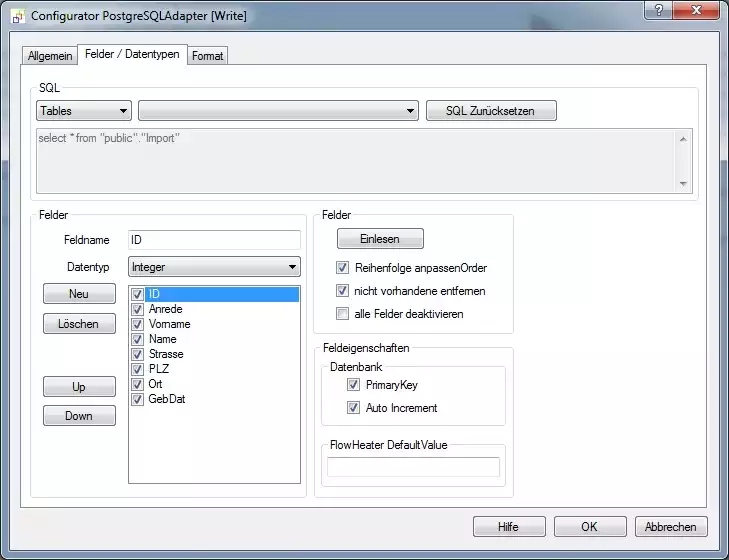 Öffnen Sie den Configurator vom PostgreSQL Adapter und deaktivieren Sie die Option "Daten aktualisieren (update)". Starten die Definition erneut und sehen Sie sich das Ergebnis an. (mit oder/und ohne Test). Der FlowHeater fügt die Datensätze erneut an die Tabelle Import an. Sie Fragen sich jetzt evtl. warum das Feld ID nicht in die Datenbank durchgereicht wird, obwohl eine Verbindung (Pipe) besteht? Das liegt an dem Feld ID, das Feld wird automatisch über die Datenbank gefüllt, da es vom PostgreSQL Datentyp Serial ist, die Pipe (Verbindung) wird hier nur für Updates benötigt.