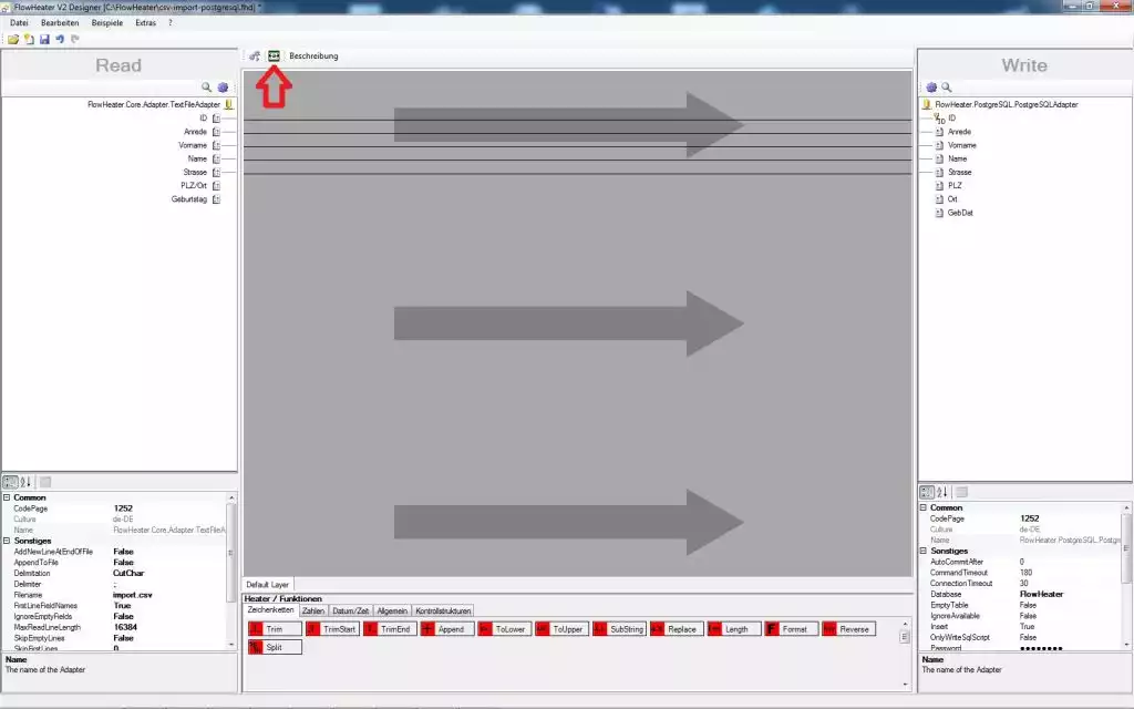 Das Beispiel zeigt wie mit Hilfe des PostgreSQL Adapters eine CSV Textdatei in eine PostgreSQL Datenbank Tabelle importiert wird. Dabei wird zusätzlich verdeutlicht wann der FlowHeater Daten beim importieren anfügt (insert) oder aktualisiert (update).