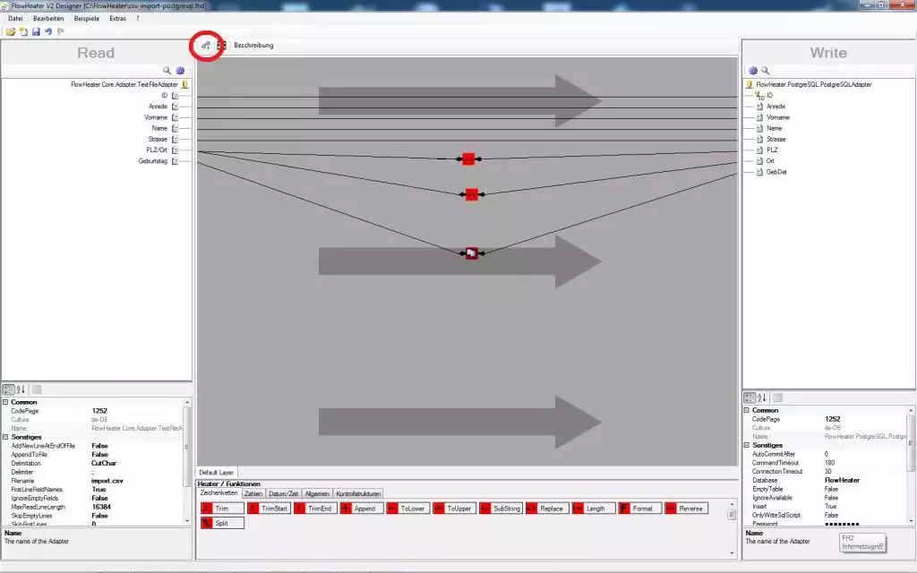 Ihr Bildschirm sollte jetzt ungefähr so aussehen. Wir haben auf der READ Seite 2 Felder und auf der WRITE Seite 3 Felder übrig. Ziehen wir zuerst das Feld Geburtsdatum per Drag and Drop auf das Feld GebDat. Danach bewegen Sie die Maus über die eben erzeugte Pipe, so dass diese Fett gezeichnet wird und klicken dann mit der rechten Maustaste um das Kontextmenü zu öffnen. Wählen Sie den Menübefehl "Clone Heater einfügen". Die Pipe (Verbindung) wird an der Mausposition unterbrochen und der Clone Heater wird dafür eingefügt. Ziehen Sie den eben erzeugten Heater ans untere Ende des Designbereichs. So jetzt haben wir Platz um das Feld PLZ/Ort in die Felder PLZ und Ort unsere PostgreSQL Tabelle zu transformieren.