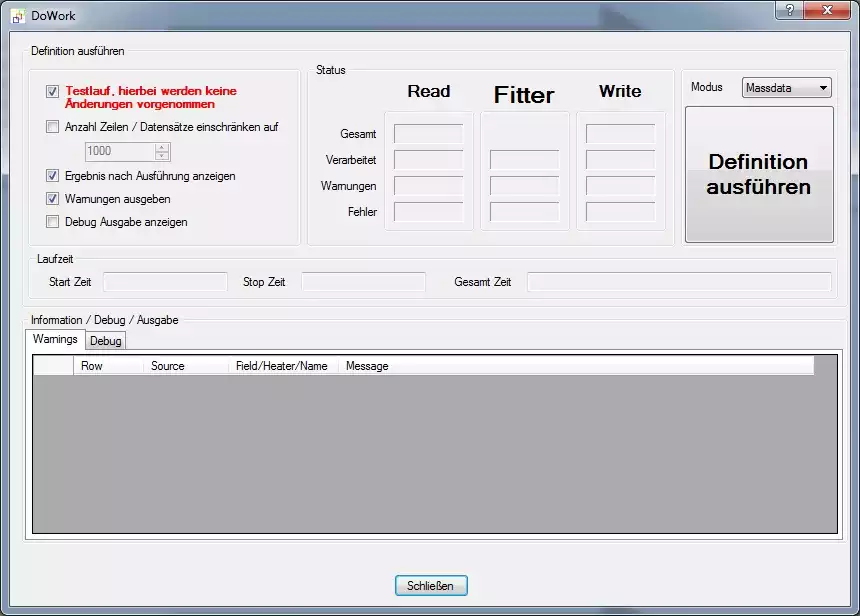 Führen wir die Definition aus, über einen Klick auf den rot markierten Button (alternativ können Sie auch die F5 Taste betätigen) öffnet sich der Test und Ausführen Dialog des FlowHeaters (siehe unten). Hierrüber können wir den Import vor dem eigentlichen importieren testen ohne dass dabei Daten im Datenziel geändert werden. Probieren wir es aus, klicken Sie ohne eine Änderungen im Test und Ausführen Dialog vorzunehmen auf den Button "Definition ausführen".