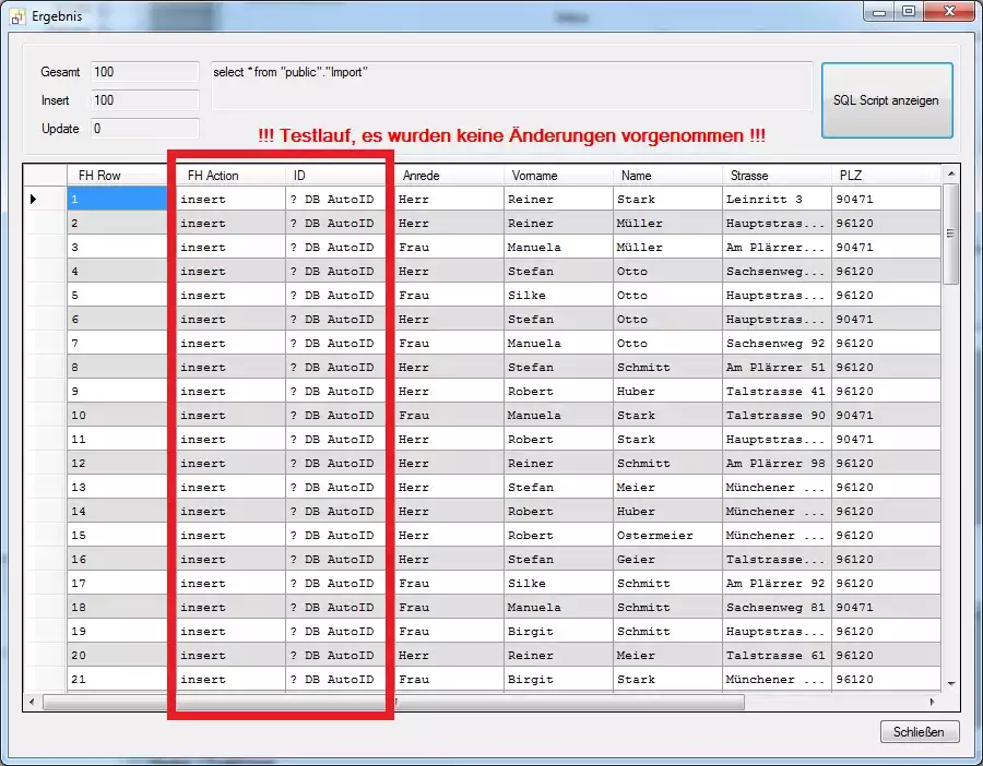 Hier sehen wir, dass der FlowHeater das Feld ID automatisch als Serial (Autowert bzw. Identitätsspalte) erkannt hat. Schließen Sie das Fenster und deaktivieren Sie die Option "Testlauf..." im Test und Ausführen Dialog und starten die Definition erneut. Jetzt wird unsere CSV Textdatei wirklich in die Tabelle "Import" des angegebenen PostgreSQL Servers geschrieben. Beachten Sie, dass im 1. Feld "FH Action" der Wert "insert" steht. Wiederholen Sie den Vorgang ein 2. mal, der FlowHeater hat erkannt, dass es sich hierbei um einen Update handelt.
