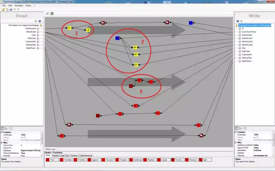Farbe Markierung 3) Hier sind wie im Excel Feld Fahrzeugcode bis zu 3 unterschiedliche Informationen untergebracht. Die einzelnen Excel Werte sollen aber in der CSV Textdatei nicht in unterschiedliche CSV Spalten sondern die Werte sollen mit einem Leerzeichen voneinander getrennt in in das CSV Feld Farbe geschrieben werden. Um dies zu bewerkstelligen verwenden wir den String Append Heater mit Gruppierungsfunktion, einzustellen über die Eigenschaften des Heaters. Dem Heater wird einmal ein Leerzeichen über den X-Value Heater übergeben (1. Parameter) und als 2. Parameter erhält der Heater das Excel Feld Farbe. Der String Append Heater gibt den erzeugten String an den Trim Heater weiter. Dieser entfernt das 1. Leerzeichen und stellt den Output in das CSV Feld Farbe ein.