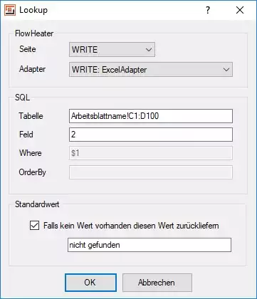 Lookup Heater - Excel SVerweis KonfigurationDer Lookup Heater unterstützt den Excel Adapter sowohl auf der READ wie auch auf der WRITE Seite, es wird im Prinzip nichts andere wie die Excel SVerweis/VLookup Funktion aufgerufen. Wurde ein Excel Adapter ausgewählt sind die Eingabefelder für „Where“ und „OrderBy“ deaktiviert. Für das Vergleichskriterium = „Where“ wird immer der erste Eingangsparameter „$1“ verwendet und „OrderBy“ kann zusammen mit der Excel SVerweis/VLookup Funktion nicht verwendet werden.