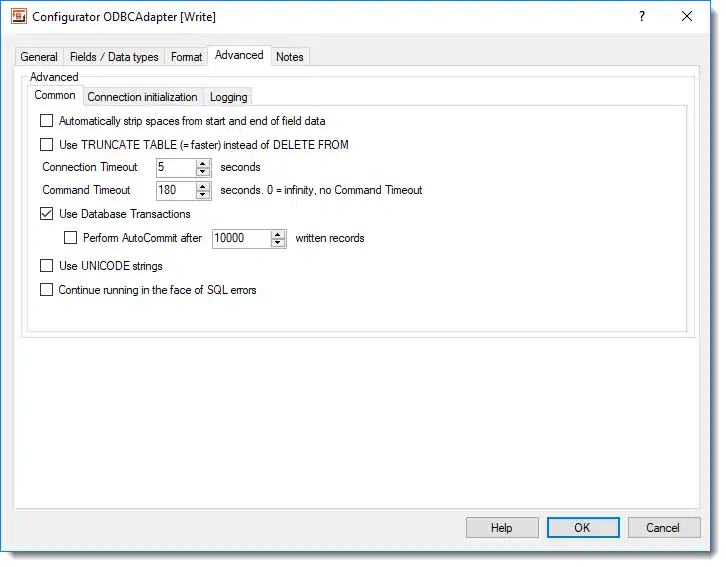 Use database transactions: This allows you to control how data is imported. According to the default settings ODBC Adapter uses a single “large” transaction to secure the entire import process. When importing extremely large volumes you may have to adapt transactional behavior to your needs using the “Run AutoCommit after writing every X records”.