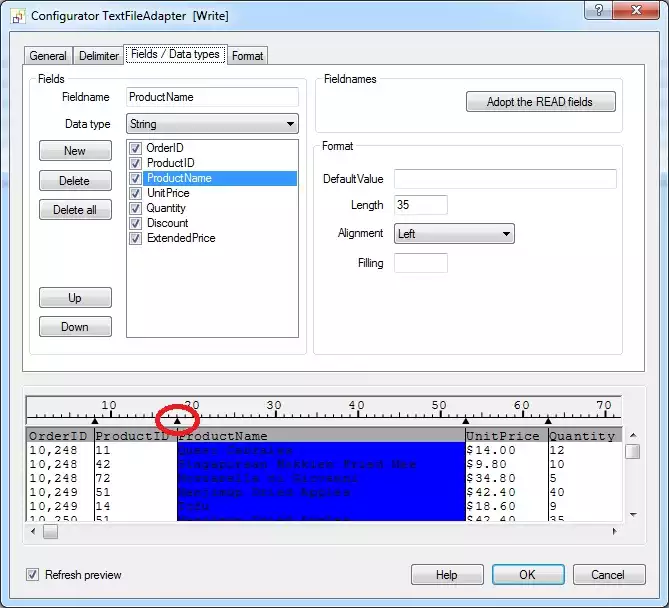 Format: In this section you can specify the field Length and Alignment (left or right justified ). Fixed field widths can either be adjusted explicitly in the Length box or graphically by using the left mouse button to drag the triangular tab stop markers along the ruler (circled here in red). The Pad character is used to define which character is used to fill out the remaining space in any fixed length field that is shorter than its maximum width (left or right justified). The standard character used is a space. Note that this only applies to fixed length fields.
