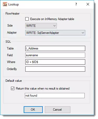 In the depicted example (above) the Lookup Heater is configured so that for each record/row on the READ side the FirstName field is obtained from the table t_Address from the database on the WRITE side, with the same ID as the current record on the READ side. Of course, the READ field ID must be connected to the first incoming parameter of the Lookup Heater.
