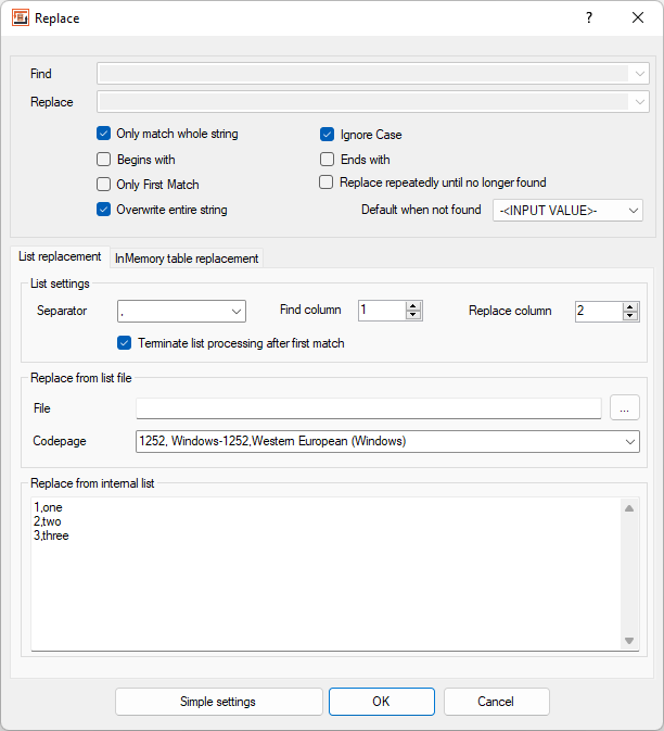 The lists are composed in the general CSV style: match value, separator, substitute value