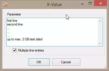 X-Value Heater - insert a static valueMultiple line entries: If you check this option it is possible to specify multiple lines. The maximum size of the text is ‘theoretically’ limited to 2 GB.