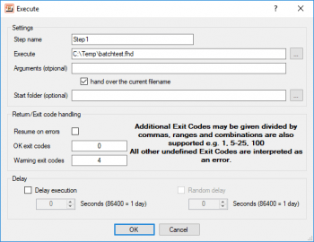 OK exit codes: Specify the return/exit codes that should be interpreted as successful execution.