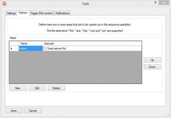 Perform tabHere you can define one or more steps that the task will execute in the sequence given. The file extensions supported include .fhd, .fhrt, .exe, .bat, .cmd and .ps1 (Power Shell). Whenever a FlowHeater Definition file (.fhd | .fhrt) is specified, the same version of FlowHeater that the Definition was created with is automatically executed. For this to work a FlowHeater version must exist in the “{Installation folder}\Versions\” folder with the corresponding version number. Both 32-bit and 64-bit variants of FlowHeater are supported. The sequence of steps listed can be modified using the “Up” and “Down” buttons.