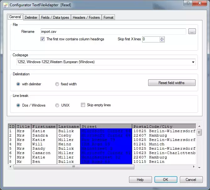CSV text file import propertiesConfirm with OK to close the popup and now open the Configurator for the READ Adapter and select the file import.csv in the directory "Examples\EN\PostgreSQLAdapter". Check the checkbox "First row contains field names" and confirm the request of whether the field names should be loaded. All other settings on this page/tab should remain their defaults.