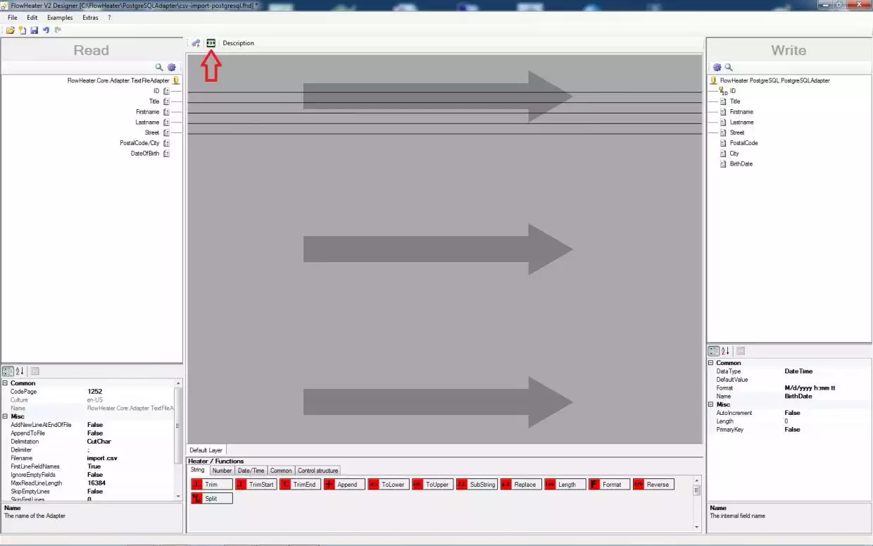 This example describes how the TextFile Adapter can be used to import a CSV text file into an PostgreSQL database table. It also explains how to configure FlowHeater for importing with insert or update SQL operations.