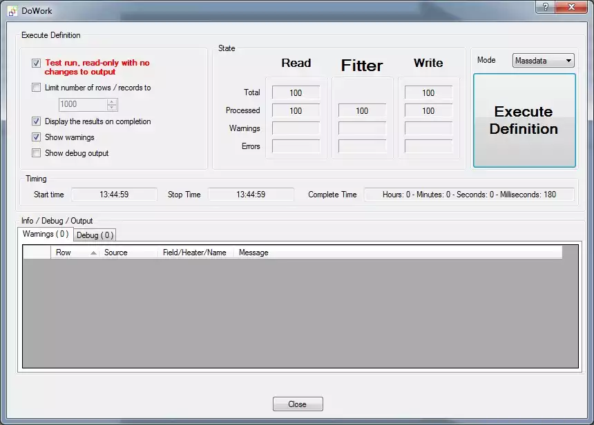 Execute the definitionNow execute the definition, either by clicking on the command button (circled in red) or by pressing F5 on the keyboard. This opens the FlowHeater execute and test window (see below). It is always prudent to first test an import before committing the actual changes to a database. So first try a test and check the results in this "Test and Execute" window. Leave the "Test run" option checked and click on the "Start Definition" button.