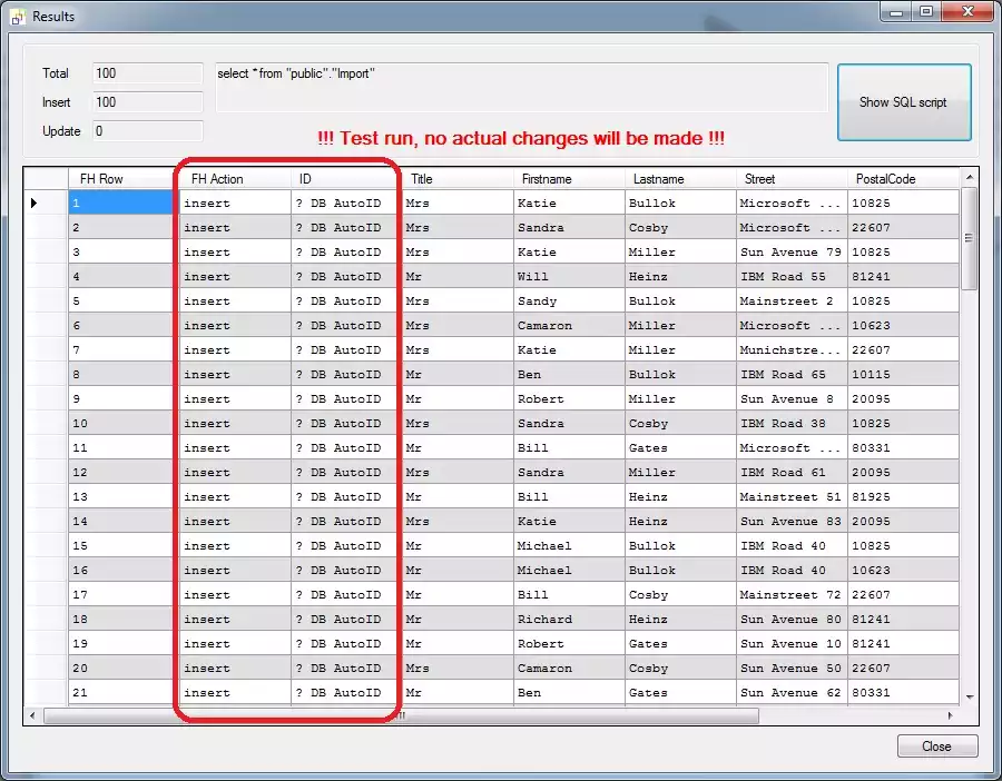 CSV import resultsHere we can see that FlowHeater has automatically recognized the ID field as an PostgreSQL SERIAL (AutoID) data type. Close the window, uncheck the "Test run" option in the Execute and Test popup window and click Start Definition again. Now our CSV text file is actually written to the Import table in your PostgreSQL database. Notice that the values in the ID column are now assigned actual values and in the first column "FH Action" has the value of insert. Run the Definition a second time and you will see that FlowHeater has recognized that this time it is a revision and so update appears in the "FH Action" column.