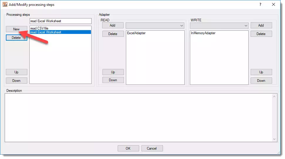 Using the menu option “Edit -> Processing Steps” add a new processing step and select for the READ side the Excel Adapter and for the WRITE side the InMemory Adapter.
