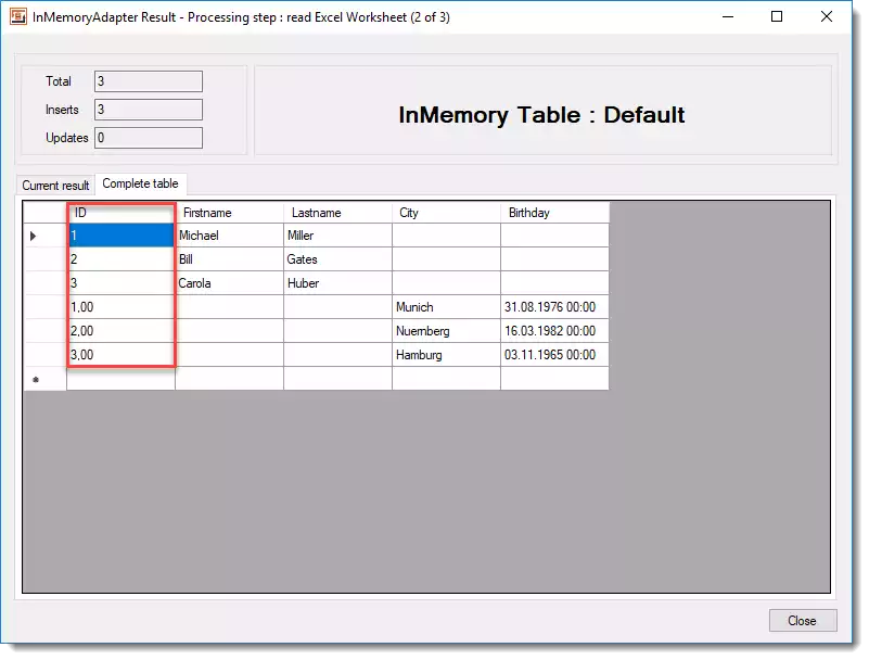 There is an easy way to find out. Configure the InMemory Adapter by also checking the option “Append data (insert)” and run the Definition again. Now we see that in the second processing step the InMemory Adapter has also added data to the table, but when we look at the format of the key field (ID) we realize why the update failed. The data from the CSV file are given as integers, whereas the data from the Excel worksheet have decimal places. We can quickly solve this problem by amending the FlowHeater data type for the key field (ID) in the InMemory Adapter to “Integer”. When we now rerun the Definition the result looks much better.