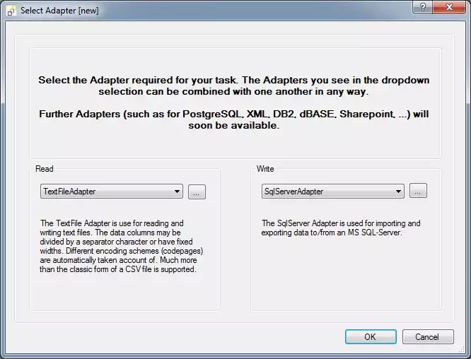 choose import AdapterNow open FlowHeater and click on the menu option "New" to create a new Definition. In the resulting popup window select for the READ side the TextFile Adapter and for the WRITE side the SqlServer Adapter.