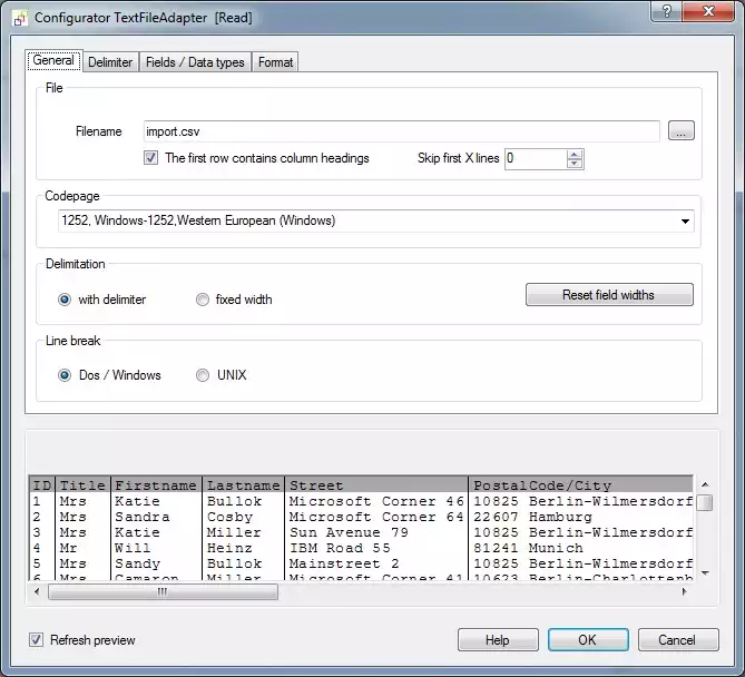CSV text file import propertiesConfirm with OK to close the popup and now open the Configurator for the READ Adapter and select the file import.csv in the directory "Examples\EN\SqlServerAdapter". Check the checkbox "First row contains field names" and confirm the request of whether the field names should be loaded. All other settings on this page/tab should remain their defaults.