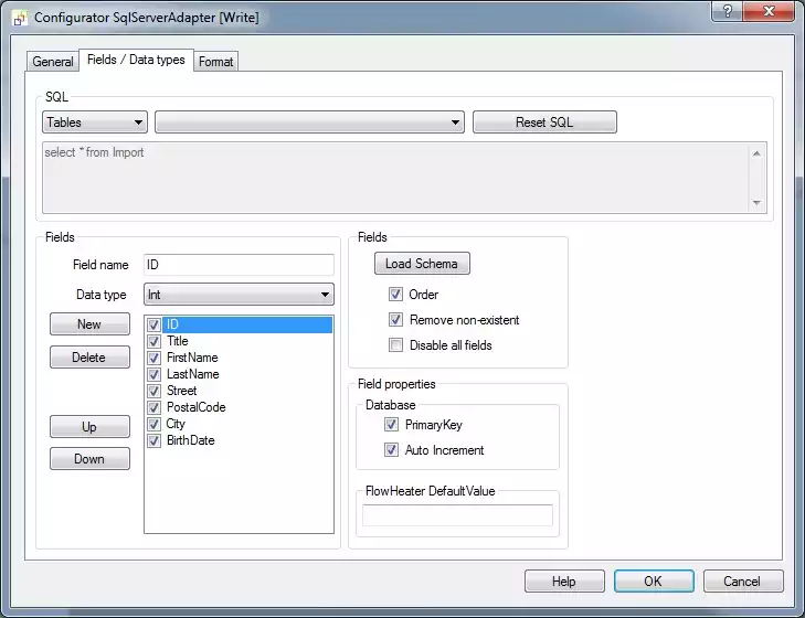 SQL Server, import fields and data typeNow switch to the Fields / Data types tab. Choose the Import table from the dropdown and then click the "Load Schema" button to load the schema. This will import the field information of the table from the SQL Server in order to save these as part of the FlowHeater Definition. The details imported include the field names, data types, key information (Primary Key) and whether a field is assigned the “Auto Increment” attribute.