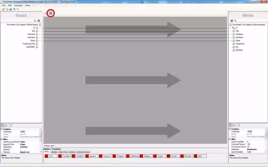 The complete Definition described here can be found in the file Examples\EN\SqlServerAdapter\csv-import-sql-server.fhd. All the examples are included in the downloaded ZIP archive of FlowHeater. The example can be used with SQL Server version 7.0, 2000, MSDE, 2005, Express Edition and 2008.