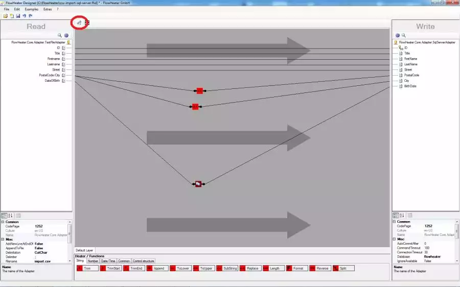 Auto connect CSV-SQL fieldsClose the Configurator popup with OK and click on the Designer command "Automatically connect fields" (circled in red). Your screen should now appear similar to the screenshot on the right. Notice that we now have 2 unconnected fields on the READ side and 3 on the WRITE side. First construct a Pipe to connect the DateOfBirth field to the BirthDate field by dragging and dropping from one field to the other. Now move the mouse over this Pipe so that it is becomes bolder, indicating it is selected, and right mouse click to open the context menu for the Pipe. Choose the menu option Insert a Clone Heater. At your right mouse click position on the Pipe a Clone Heater will be inserted. Drag the newly inserted Heater further down the design area, stretching the Pipe with it. This makes some space where we can to insert two more Heaters, to split the combined PostalCode/City string field into two separate string fields as PostCode and City in our SQL-Server table.