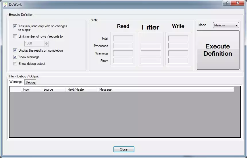 Execute the definitionNow execute the definition, either by clicking on the command button (circled in red) or by pressing F5 on the keyboard. This opens the FlowHeater execute and test window (see below). It is always prudent to first test an import before committing the actual changes to a database. So first try a test and check the results in this "Test and Execute" window. Leave the "Test run" option checked and click on the "Start Definition" button.
