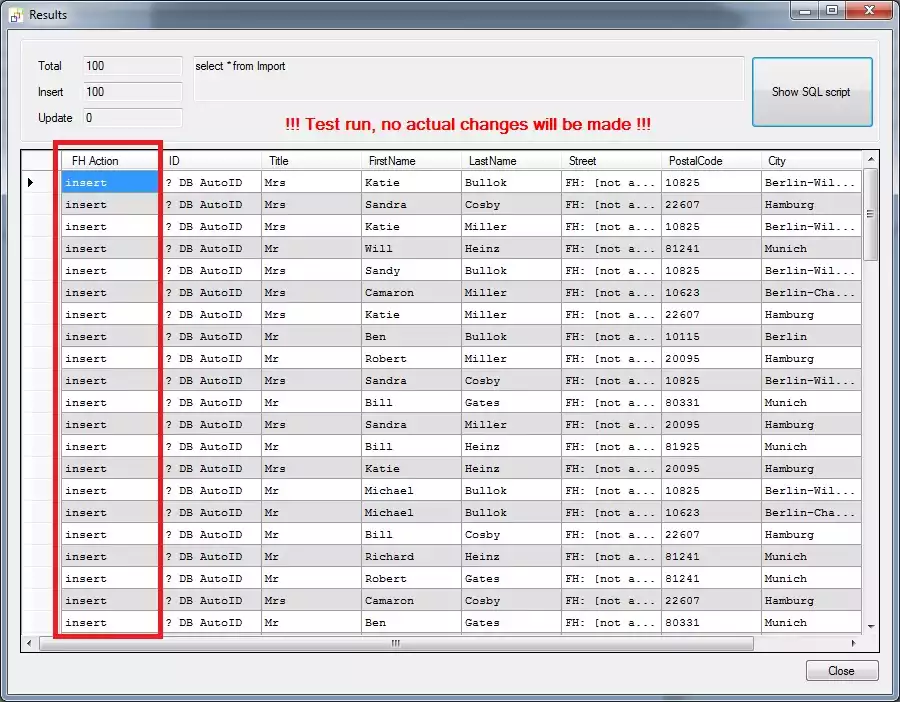 CSV import resultsHere we can see that FlowHeater has automatically recognized the ID field as an automatic or identification value. Close the window, uncheck the "Test run" option in the Execute and Test popup window and click Start Definition again. Now our CSV text file is actually written to the Import table in your MS Sql-Server database. Notice that the values in the ID column are now assigned actual values and in the first column "FH Action" has the value of insert. Run the Definition a second time and you will see that FlowHeater has recognized that this time it is a revision and so update appears in the "FH Action" column.